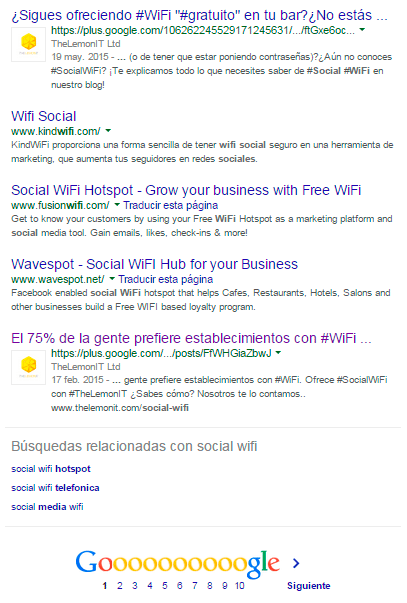Ah! No te olvides de tener un perfil en Google+ y compartir todas publicaciones en él. ¿Quieres tener un buen posicionamiento en Google pero olvidas a su red social? ¿No te das cuenta de que tiene un tratamiento especial? Además, al tener un perfil de empresa y publicar en nombre de tu empresa, hará que todas tus publicaciones se asocien a tu perfil y aparecerás entre los primeros puestos con tu imagen de perfil.
