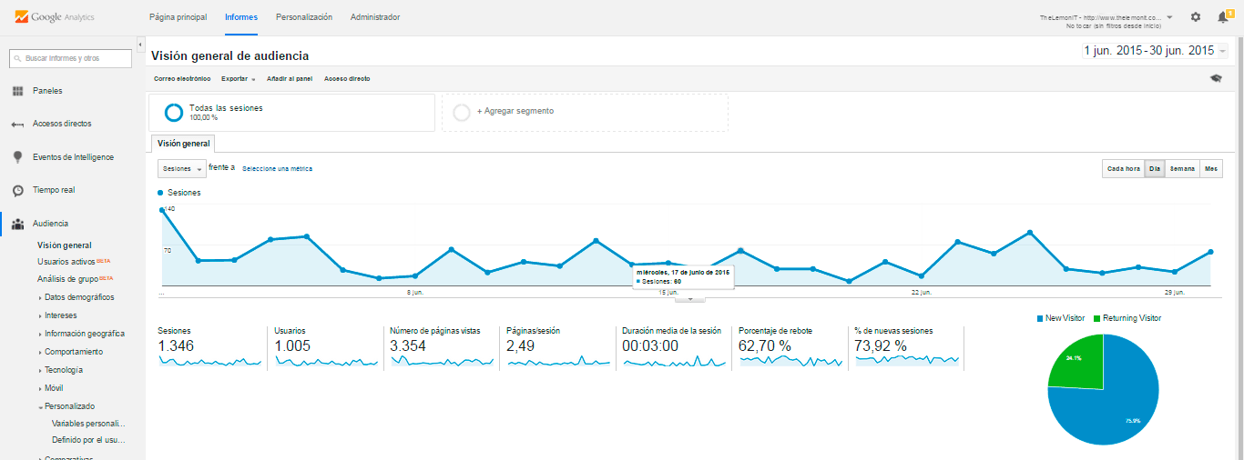 Si nos vamos a la pestaña de Informes nos lleva a Visión General de Audiencia donde nos mostrarán los mismos datos resumidos que en la página principal, pero de una manera más visual: