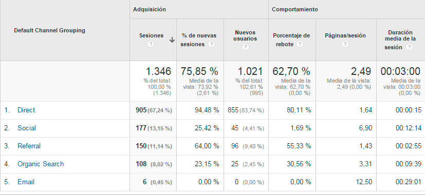 En Todos el tráfico verás un informe resumido por canales: cuántos usuarios han entrado en tu página por búsqueda orgánica, por otras páginas referidas, por redes sociales, por emails que hayas enviado o cuántos han entrado de forma directa.