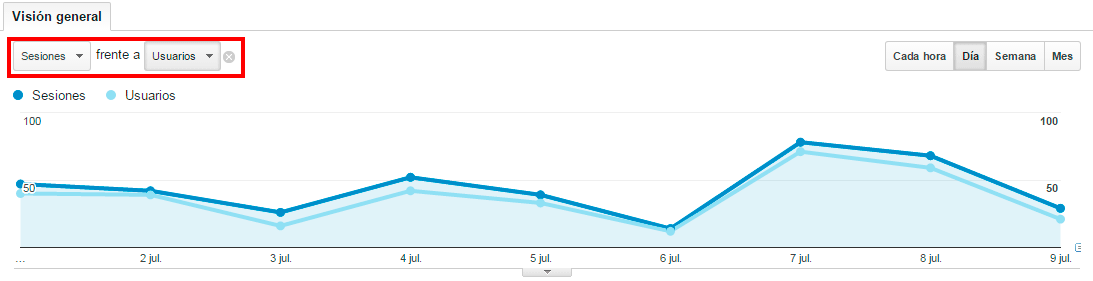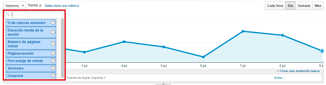 Si nos situamos en la parte superior izquierda de la gráfica, podemos observar que los datos que nos muestra la gráfica son las sesiones que ha habido en tu web, y la gráfica te muestra los datos por días (por defecto) y debajo de la gráfica se muestra el número total de sesiones que ha habido en las fechas elegidas. Pero también podemos ver por horas, días, semanas o meses las siguientes métricas: