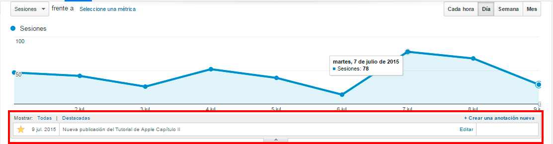En la gráfica que se muestra a continuación, puedes ver por horas, días, semanas o mes las sesiones que ha habido en tu página web en la fecha que haya introducido, e incluso anotar alguna aclaración.