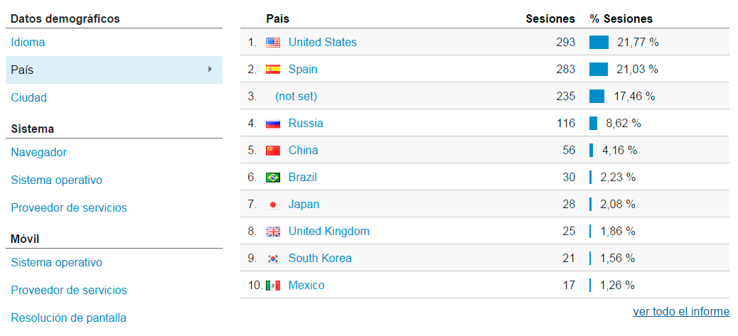 - En la columna izquierda puedes elegir entre datos demográficos (idioma, país o ciudad), sistema (navegador, sistema operativo o proveedor de servicios) y móvil (sistema operativo, proveedor de servicios o resolución de pantalla).